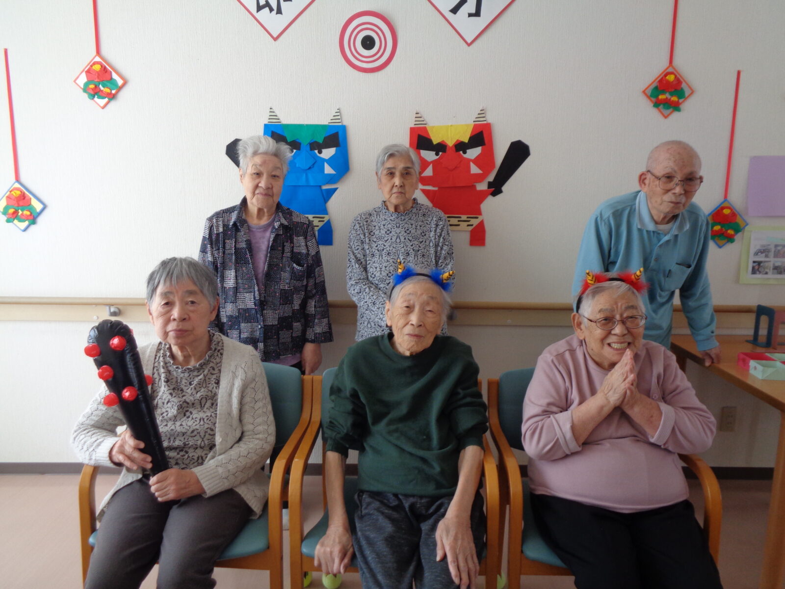 2月3日、皆さんで豆まきをしました。角のカチューシャと金棒を持って鬼になりました…